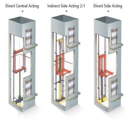 Hydraulic elevators are used extensively in villa or buildings up to ve stories high. These elevators do not use the large overhead hoisting machinery the way geared and gearless traction systems do.